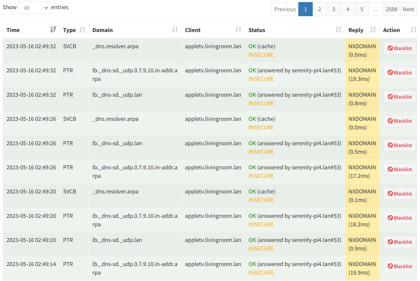 I am seeing a 4th gen apple tv making tons of requests in pihole's log even when it is "sleeping." Approx 22,000 requests in the past 24. When I export that list and do an analysis of it, here is what I am seeing (last 10 entries):