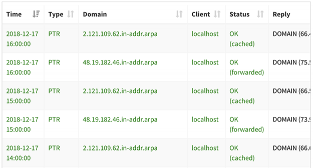 after successful updating to 4.1 some PTR logs appear every hour. Both (reverse) IPs are the DNS I am using in PiHole.