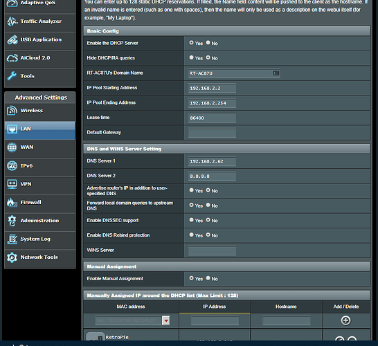 "First you put twice in the upstream DNS the local address. If Pi-hole is running on the Asus then twice 192.168.2.62."