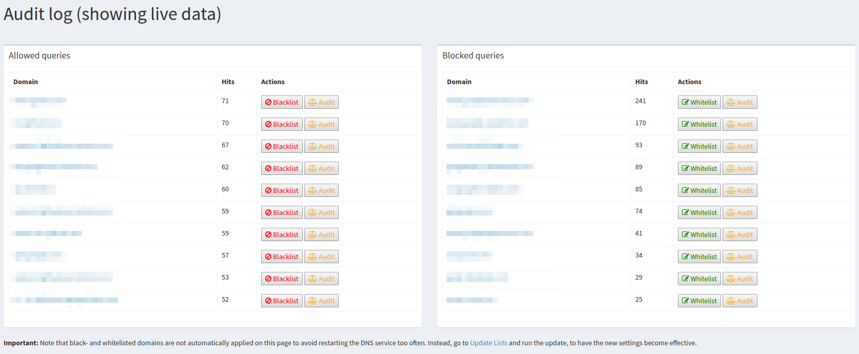 Can you add some functionality to the audit log page that registers when you have made changes to black/whitelist and prompts you to Update the lists? A fat button "Update lists" would be helpful too. It's somewhat unintuitive to make changes to abstract lists and then having to pull up what looks and feels like an update tool to write these changes.