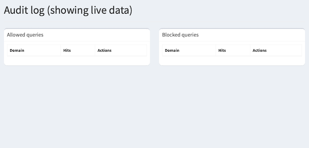 My understanding is that it should contain a replica of the Top Permitted Domains and Top Blocked Domains lists from the main dashboard, and that I don't have to do anything special to have it populated with unaudited domains. Is that correct? However it's just permanently blank here. The file /etc/pihole/auditlog.list doesn't exist (which is probably normal since I've not yet clicked any Audit buttons, since I don't have any to click).