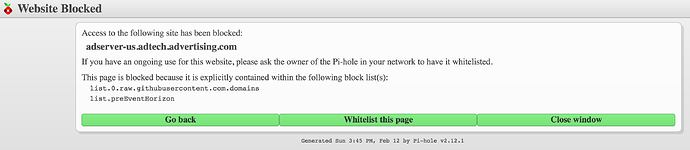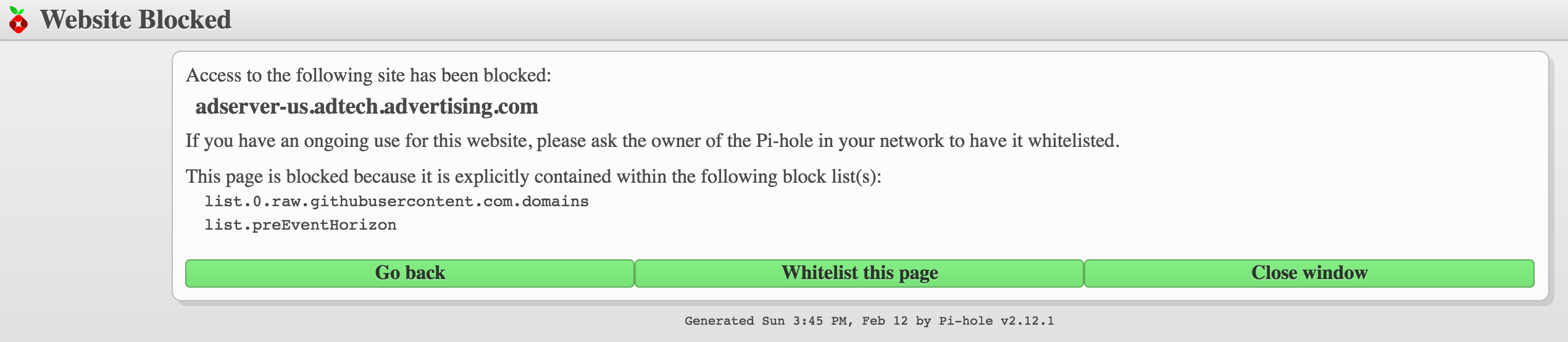 And if you go directly to this domain, you will end up at the Pi-hole block page, which is the expected behavior.