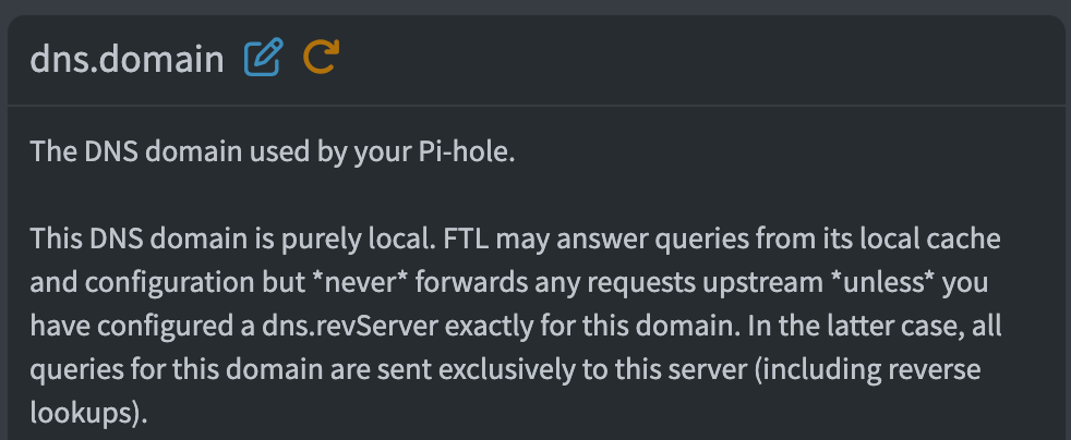 "The DNS domains for your Pi-hole. This DNS domain is purely local. FTL may