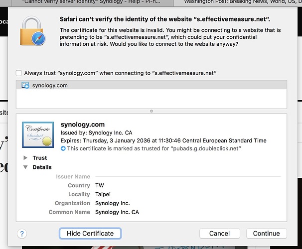 Thanks! I do have VPN installed on the same machine as Pi-Hole (Synology NAS), to have the filtering even outside the LAN, but the same messages pop up even if it's disconnected and/or disabled.