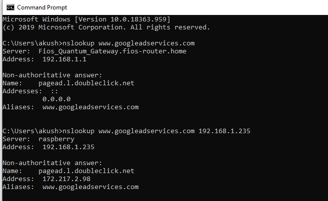 The second lookup -forced through Pi-hole's IP- shows that Pi-hole is allowing www.googleadservices.com to resolve correctly.