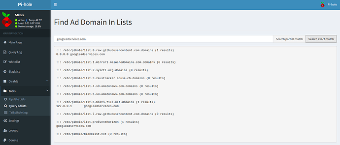 @DL6ER here is the output of the command you requested $ pihole -q googleadservices.com -exact ::: /etc/pihole/list.0.raw.githubusercontent.com.domains (1 results) 0.0.0.0 googleadservices.com ::: /etc/pihole/list.1.mirror1.malwaredomains.com.domains (0 results) ::: /etc/pihole/list.2.sysctl.org.domains (0 results) ::: /etc/pihole/list.3.zeustracker.abuse.ch.domains (0 results) ::: /etc/pihole/list.4.s3.amazonaws.com.domains (0 results) ::: /etc/pihole/list.5.s3.amazonaws.com.domains (0 results) ::: /etc/pihole/list.6.hosts-file.net.domains (1 results) 127.0.0.1 googleadservices.com ::: /etc/pihole/list.7.raw.githubusercontent.com.domains (0 results) ::: /etc/pihole/list.preEventHorizon (1 results) googleadservices.com ::: /etc/pihole/blacklist.txt (1 results) googleadservices.com