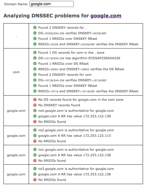 As for the google zone, you can see all of the google.com have a red "No RRSIGs found" which means the records are not signed, and the google.com zone has "No DNSKEY records found". That means the entire zone is not signed and DNSSEC isn't enabled on the zone so there is no attempt to validate DNSSEC for the google.com zone.