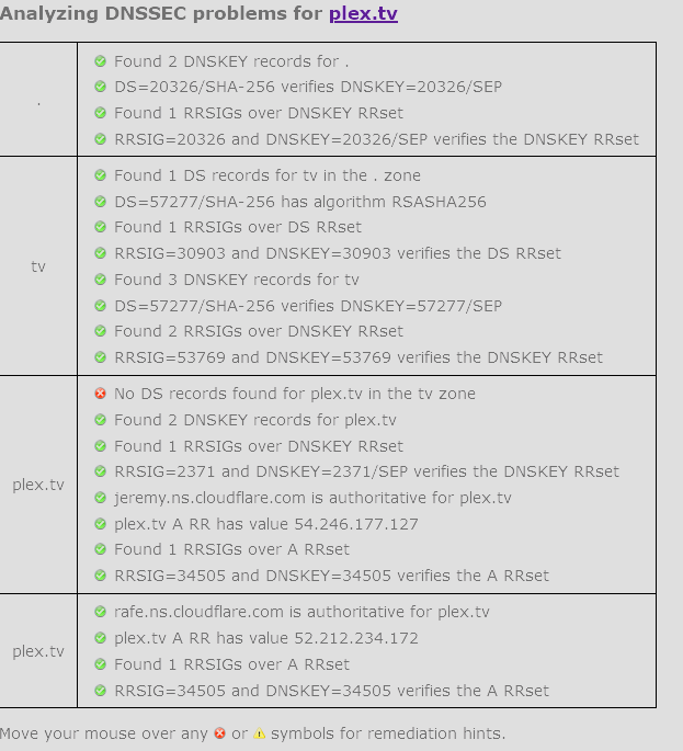 Compare that to how Plex has signed RRSIGs and DNSKEY records. They've just broken the chain so that you can not validate the signed records. That's why DNSSEC validation fails, this is one of the situations that DNSSEC was designed for and the failure of the validation is correct.