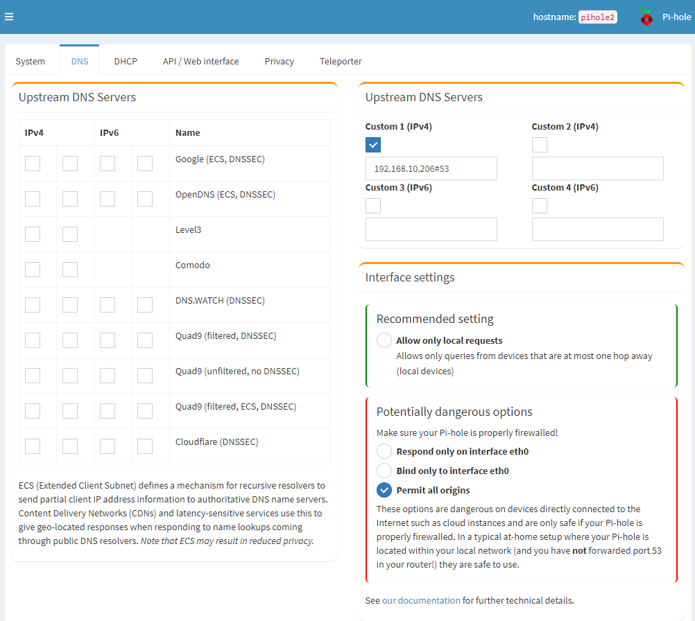 I've been looking and looking something fierce and it's time to ask for some assistance. I love the idea of running pi-hole, but I would like to run it on a system with multiple network interfaces that point to different vlans. Example is: the system I have running has 2x Realtek RTL8111/8168/8411 controller's. One interface is set to point at my internal vlan (192.168.1.x) and the other interface is setup to point at my guest vlan (10.0.0.x). I would like if possible to understand if it is at all possible without getting into conditional forwarding at this time if I can some how get Pi-Hole to see both interfaces, then I could point my UDMP's DNS correctly for both vlan's to the unit.