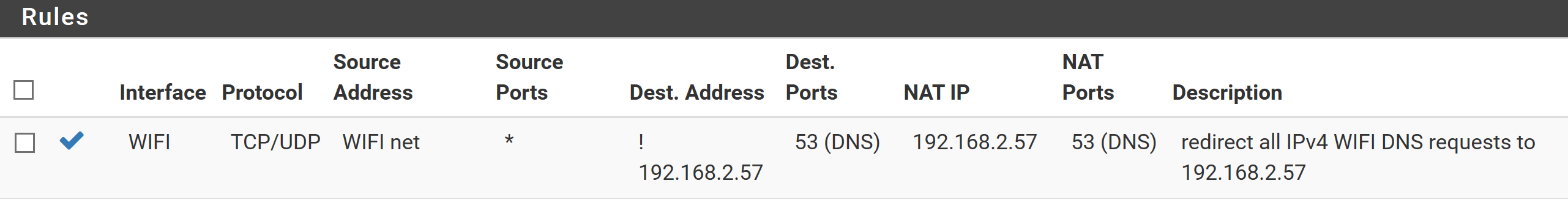 Warning !!! In this example, the pihole is on a different physical network (wired - ethernet), this rule will NOT work if you are using pihole on WIFI. The pihole will NOT be able to resolve DNS requests.