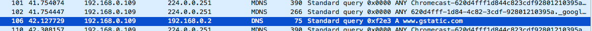 106 42.127729 192.168.0.109 192.168.0.2 DNS 75 Standard query 0xf2e3 A www.gstatic.com
