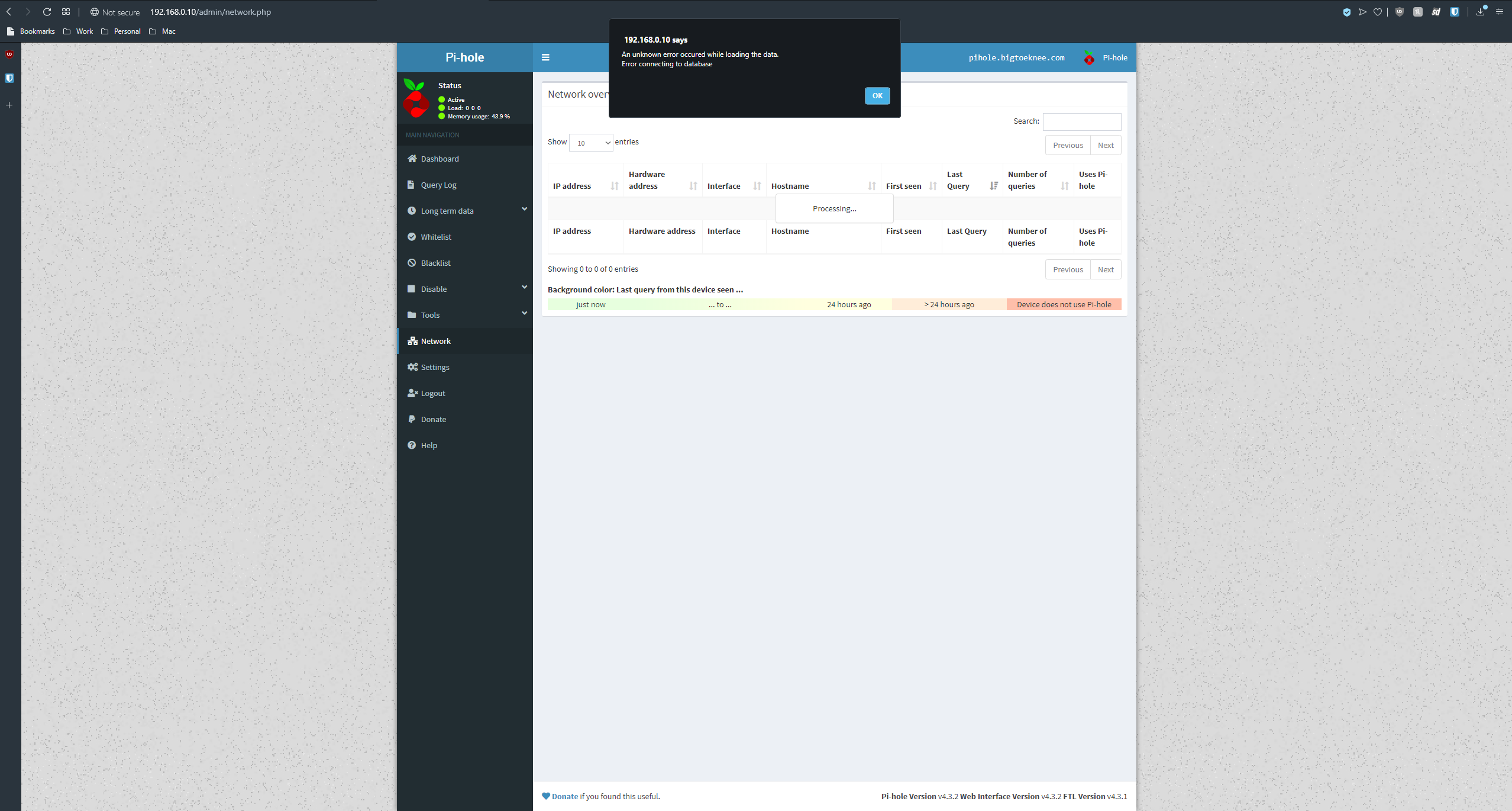 [Not seeing any data and get errors when accessing blocklists and trying to query logs. I see no logging at all when trying to tail from web interface]