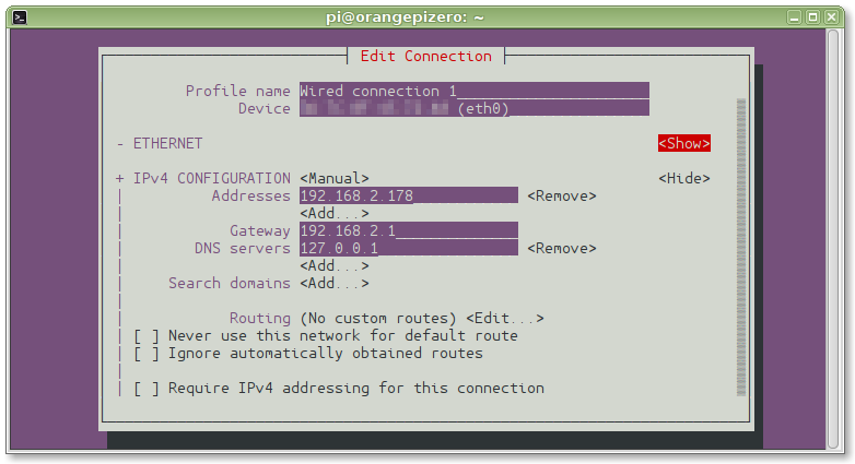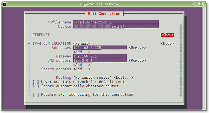 As many of the users here, my local network is based on WIFI router - which is managing my DHCP, so after a fresh install of Armbian, full package update and simple root password change I've started with assigning a static IP to the board. My primary router is located at 192.168.1.1, it's DHCP pool is defined as follows: 192.168.1.50-255. So using nmtui I've set the following configuration to ORPi's eth0 interface: