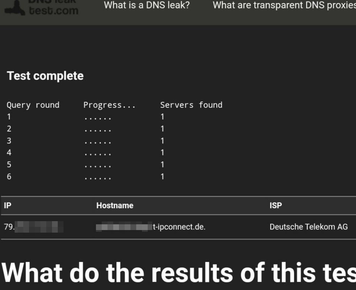What should be displayed under dns-leak.com now? The IP of my RaspberryPi? Aktually its my Provider (Telekom).