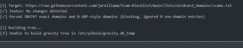 [✗] Unable to update status of adlist with ID 11 in database /etc/pihole/gravi ty.db_temp