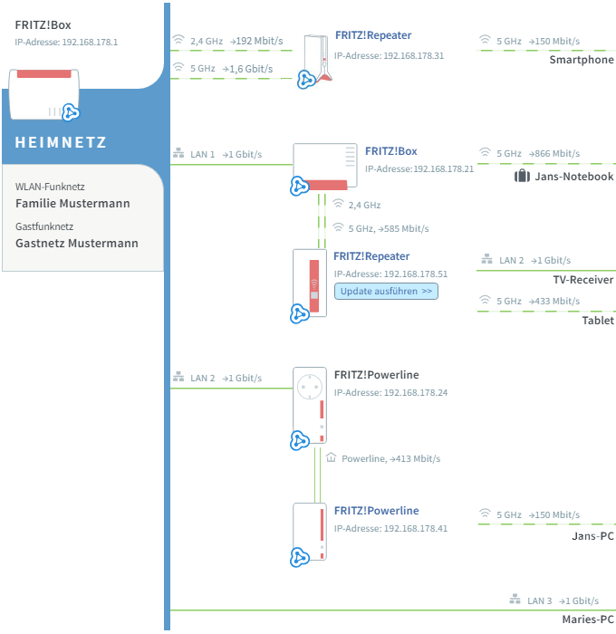 Der AP registriert den Verbindungsversuch des Smartphones, führt eine Authentifizierung durch und registriert die MAC-Adresse des Smartphones für sein WLAN-Interface. Anschliessend meldet es diese MAC-Adresse an die FB, die wiederum diese MAC-Adresse nun für ihr entsprechendes LAN1-Interface registriert.