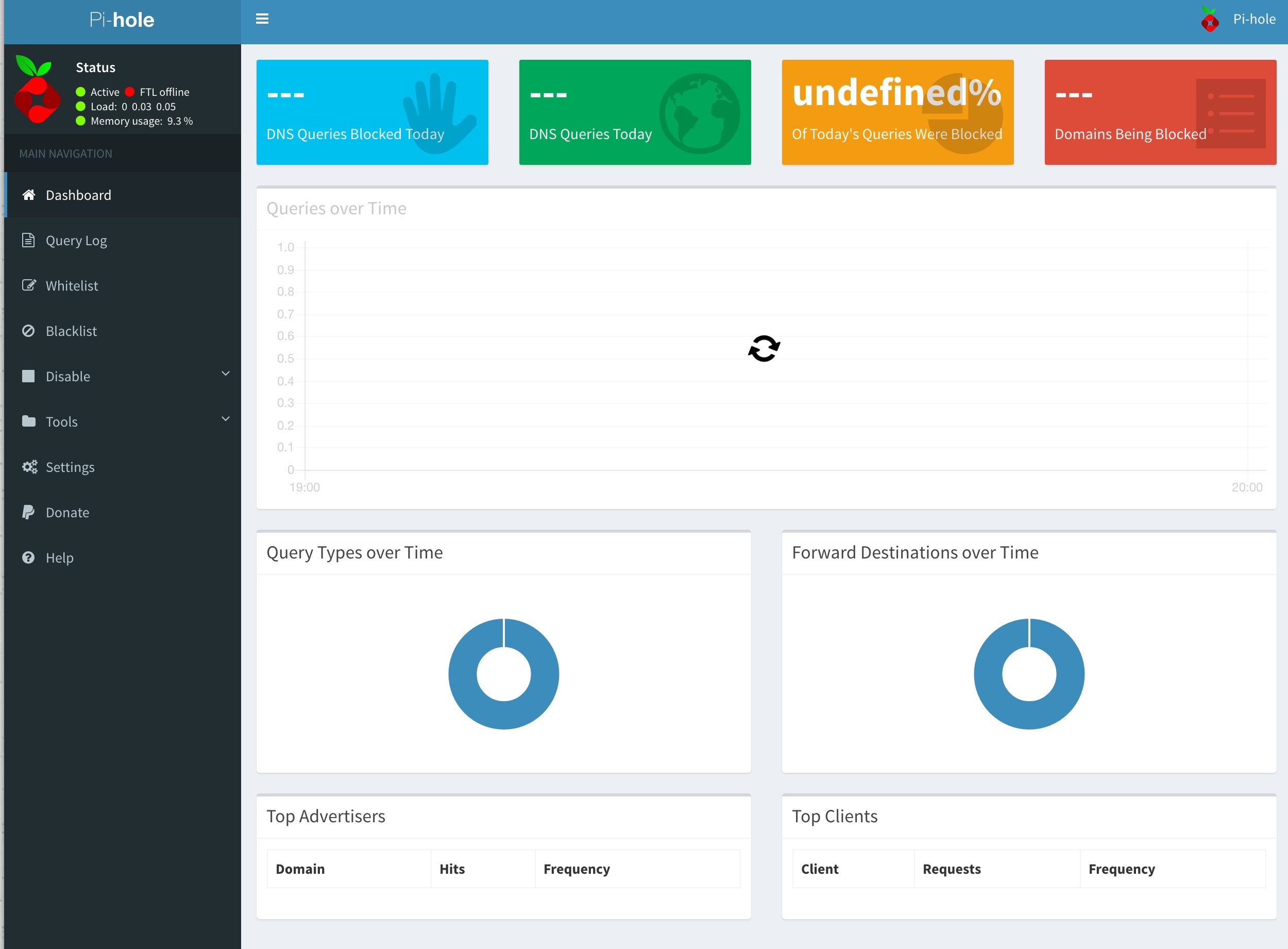 I also suspected the same thing, I cleaned the cache. But nothing happened. I uninstalled and reinstalled pihole, now everything is working fine. However it's showing 'queries over time' graph only and graphs (pie chart) about 'query types' and 'forward destinations' are missing....