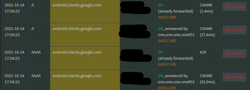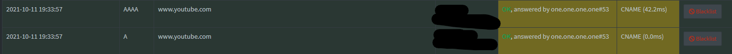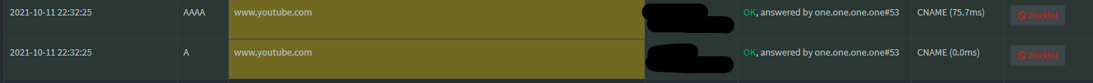 [2021-10-11 22:32:25.154 18362M] **** new UDP IPv4 query[AAAA] query "www.youtube.com" from wlan0:192.168.178.20#58875 (ID 1261, FTL 36381, src/dnsmasq/forward.c:1577)