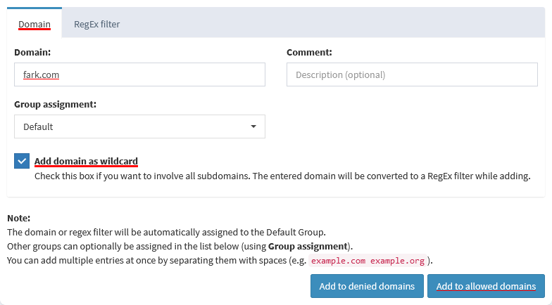 I added fark.com to my list of domains with type "exact allow" and enabled. I hoped that would allow all ads on Fark.com