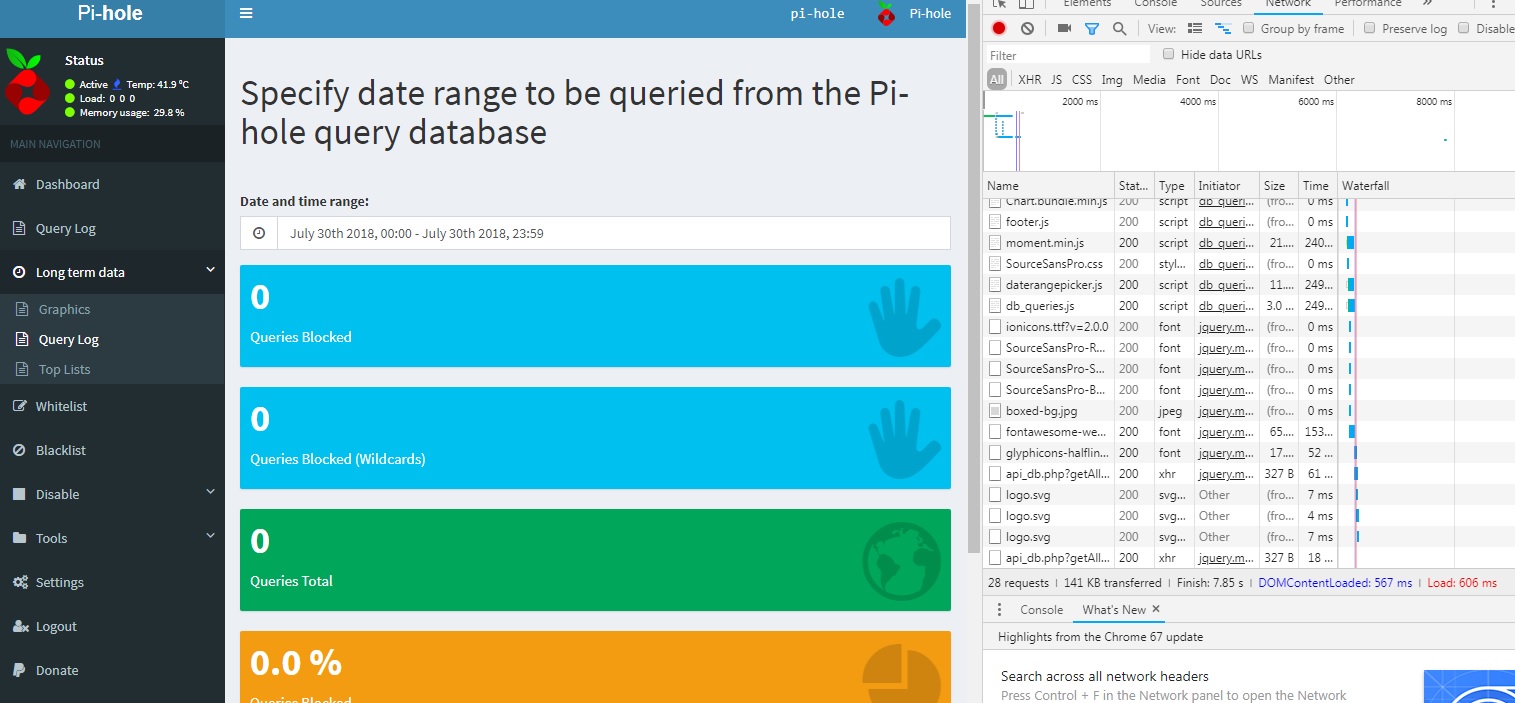None of the historical data is available to sort through or browse. The main screen is showing that its blocking, with statistics. But long-term data requests never resolve.