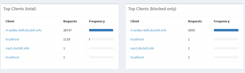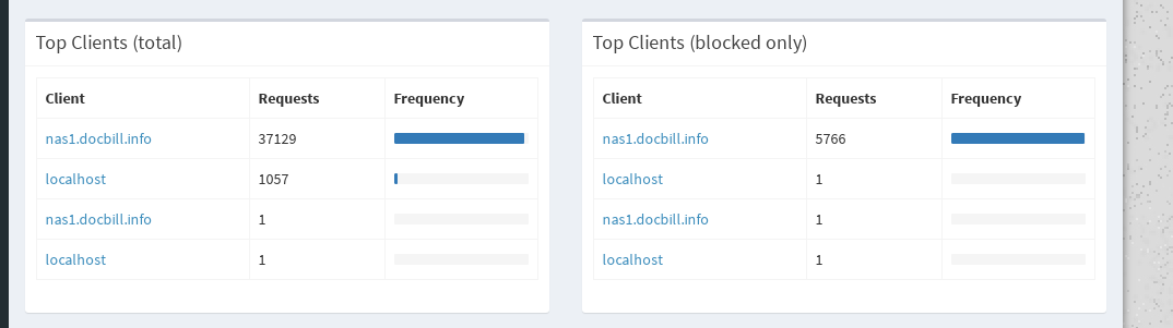 As you can see it shows all the queries coming from nas1.docbill.info and localhost. Even though I can see pihole filtering is working normally on all my devices.