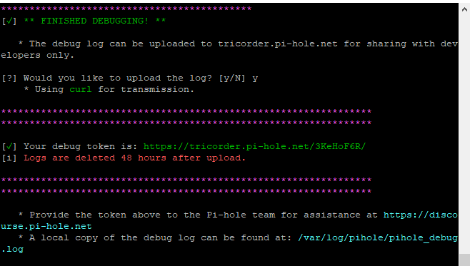 As for the debug token, when you run pihole -d, it will ask at the end of the process if you want to upload the token for developers to view. Choose yes and share the token here please - we can take a look and help you troubleshoot to get it working as expected.