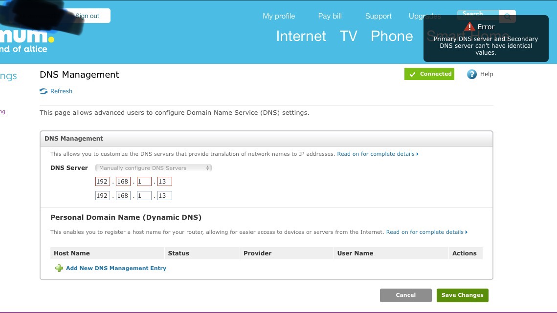 If i put in second set of boxes the isp dns ip and in first set of boxes pihole ip i also get error