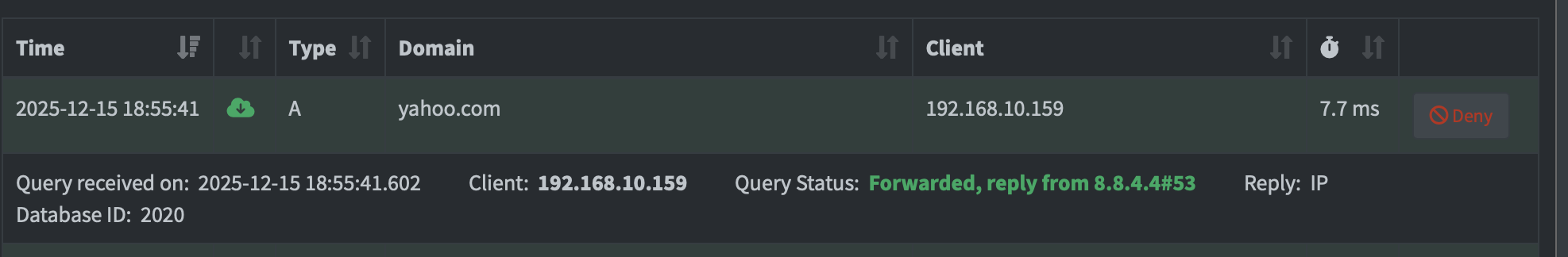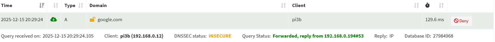 My assumption is that I should be able to capture the request from pihole to Google and the response from Google to pihole if the domain I’m looking up is not already cached.