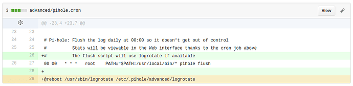 notice the reboot parameter on the @reboot line, it makes piholeLogFlush check the date of the pihole log (first line)