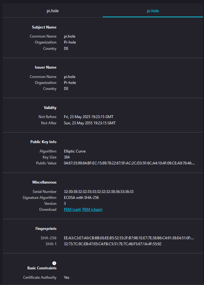 I see. My apologies, it does seem there are two certificates that pi-hole uses, which would indicate a Certification Authority.