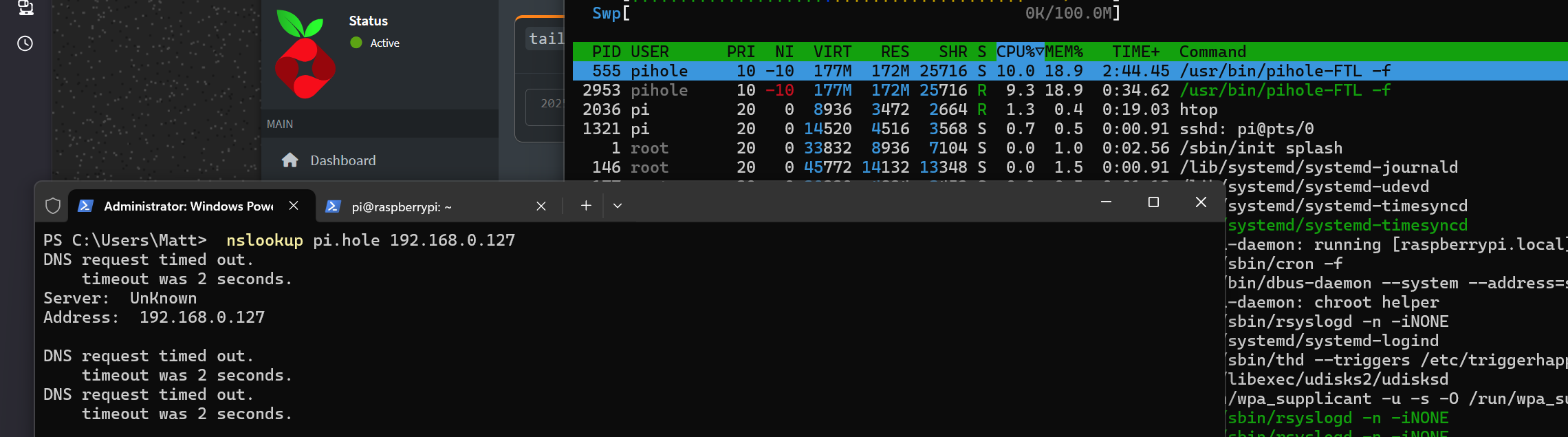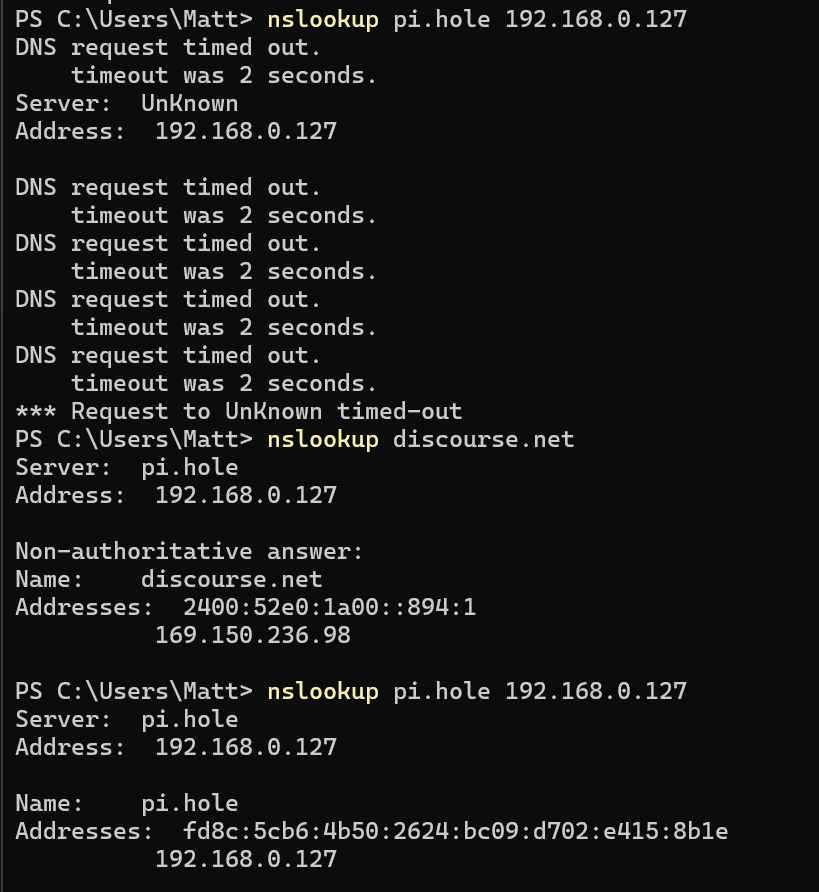 I am consistently getting DNS lookups that fail consistently across the environment (example below). There does not seem to be consistent timing / behavior for when they file. Based on other issues I ran "pihole repair" and retested but am still seeing consistent failures. This instance has been up and functional for a long time but this behavior seems to have become prevalent after a I switched to an Eero based Wifi system. I have configured Eero with Custom DNS specifying the PiHole IP Address (192.168.0.127).