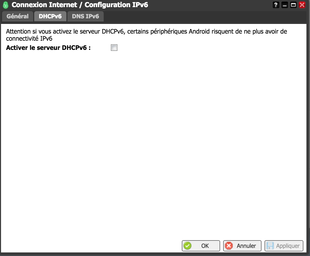 No getting IPv6 on Armbian. Its configured (Works perfectly in my network other devices..) but on http://ipv6-test.com/, getting nothing in the IPv6 section.