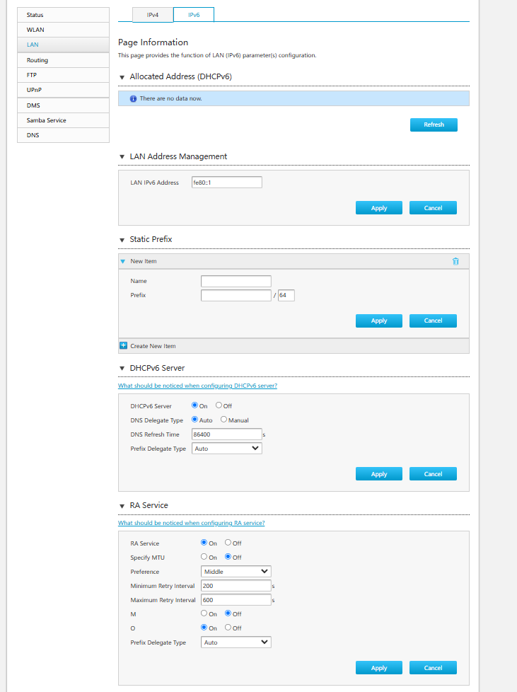 I'm trying to setup Pi-hole on a ZTE H6645P router. As for configuring DNS for IPv4, I didn't encounter any problems - it was quick and easy setting up the Raspberry's IPv4. However, the problem arises with IPv6, as the ZTE router prefers IPv6 instead of IPv4. This causes some devices not to be filtered via Pi-hole. Alternatively, as indicated in the Pi-hole guide, it is suggested to enable ULA by generating a 40-bit prefix via RFC 4193, with the rest of the prefix at the user's choice, and setting the Local DNS via the ULA prefix and l 'Raspberry IPv6. However, in the ZTE router configuration menu I don't see any option to configure ULA or SLAAC (I noticed that RA is also there, but I can't change it).