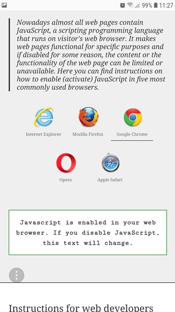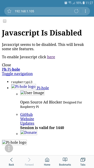 Trying to access my Pi-Hole via my Phone (Galaxy S7 running Oreo) using any web browser (Tested Samsung stock, Firefox, Chrome and some other 3rd party) I constantly get "Javascript is disabled" error message as shown below, yet going to the Javascript test page it shows that it is indeed enabled and working in my browser