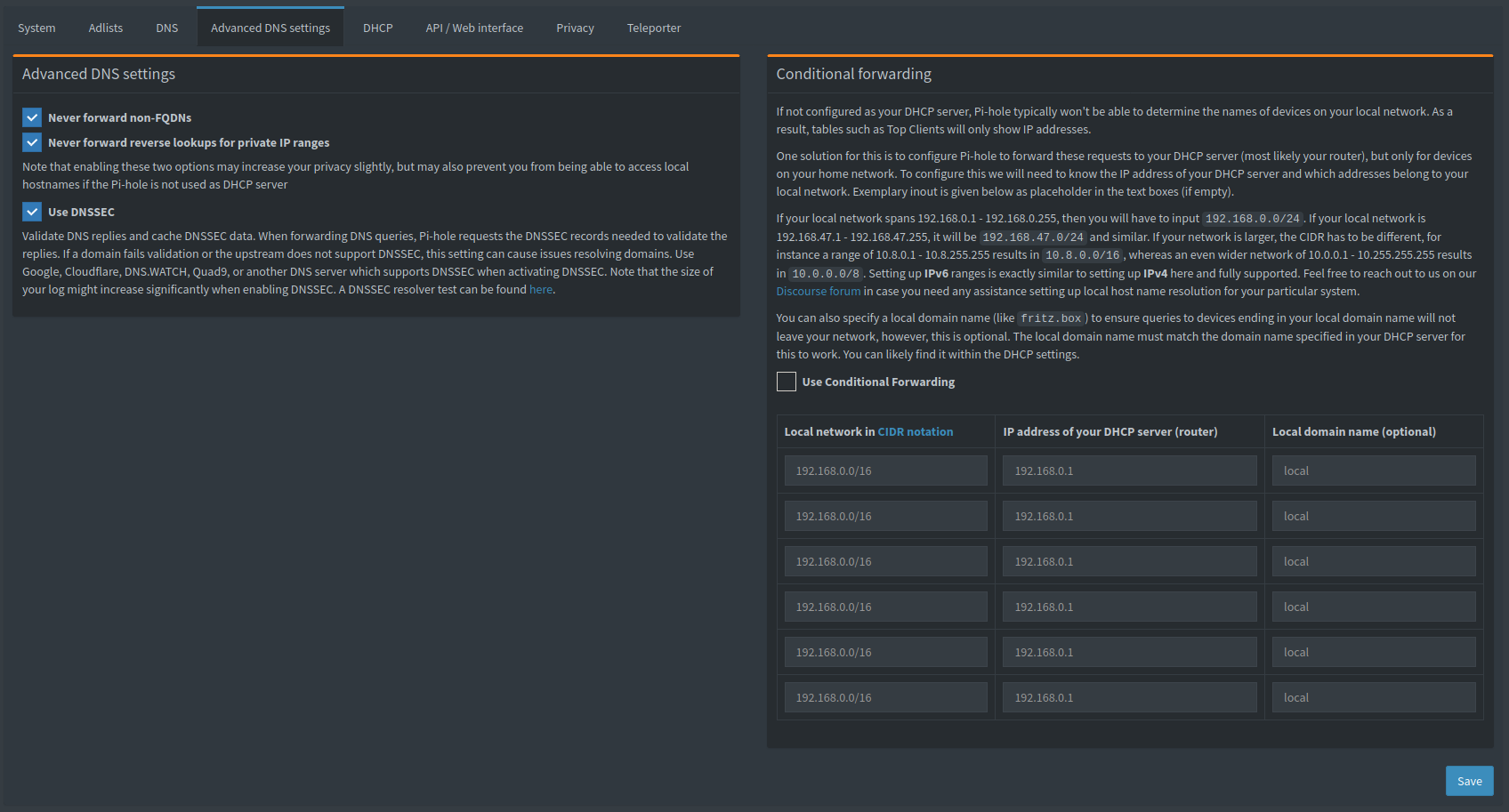 ok - i had a look at the thing on our pi. in /etc/dnsmasq.d/ i currently have 01-pihole.config that will be the config-file automatically created by the installer or webinterface? and there are also the current entries for rev-server and server. is '42-conditional-fwd.conf' a magic name for a manual config-file that is automatically loaded at startup and overrides the settings in '01-pihole.config'?