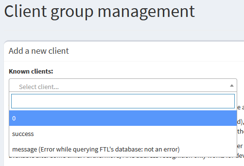 Hm, I do want to find out what's wrong with the client list. Whenever I either import just the clients from the 1st to the 2nd instance or use gravity-sync (push 1st to 2nd or pull from 1st to 2nd) to get the whole gravity DB, the Clients tab keeps Loading.... Therefore, I suspect that already on my 1st instance, something is wrong with the clients table.