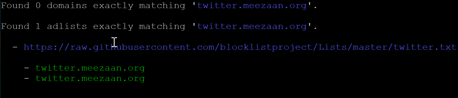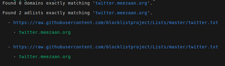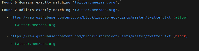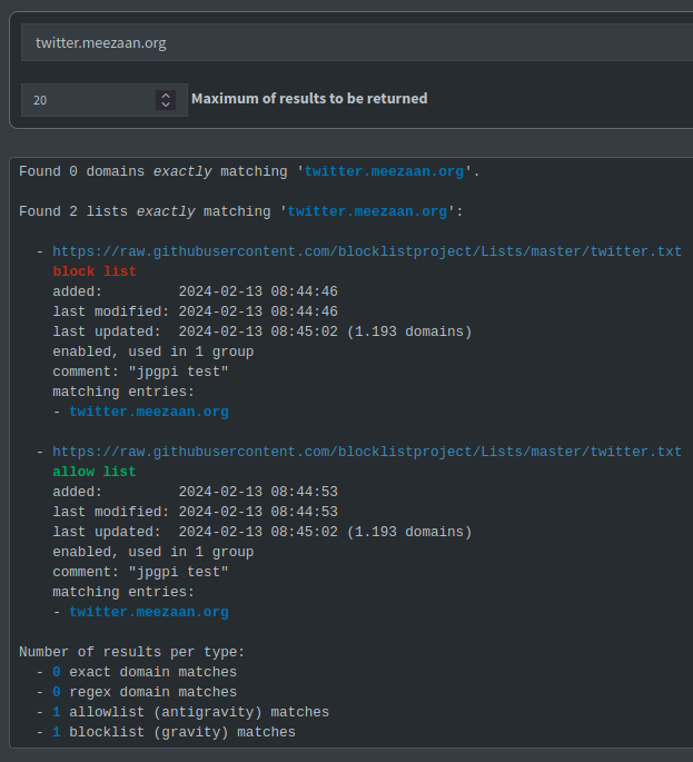 pihole -q (command line) -> both lists are identified, but the type info (block list // allow list is missing).
