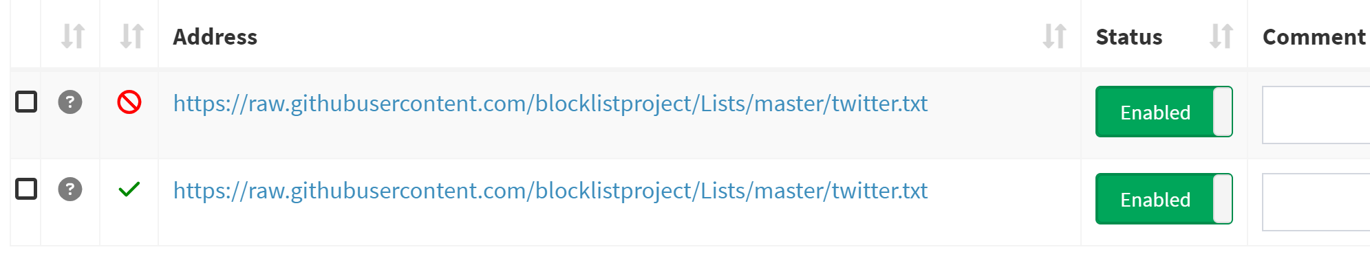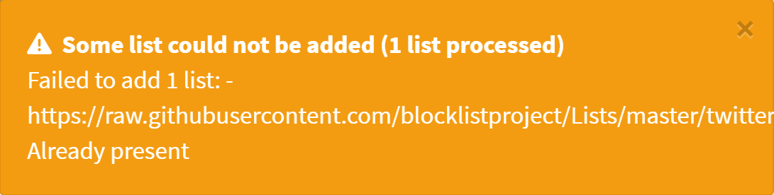To ensure this works, the lists needs to be entered as blocklist ( -> gravity) and as allowlist (-> antigravity). Currently, you can't add both entries, see error.