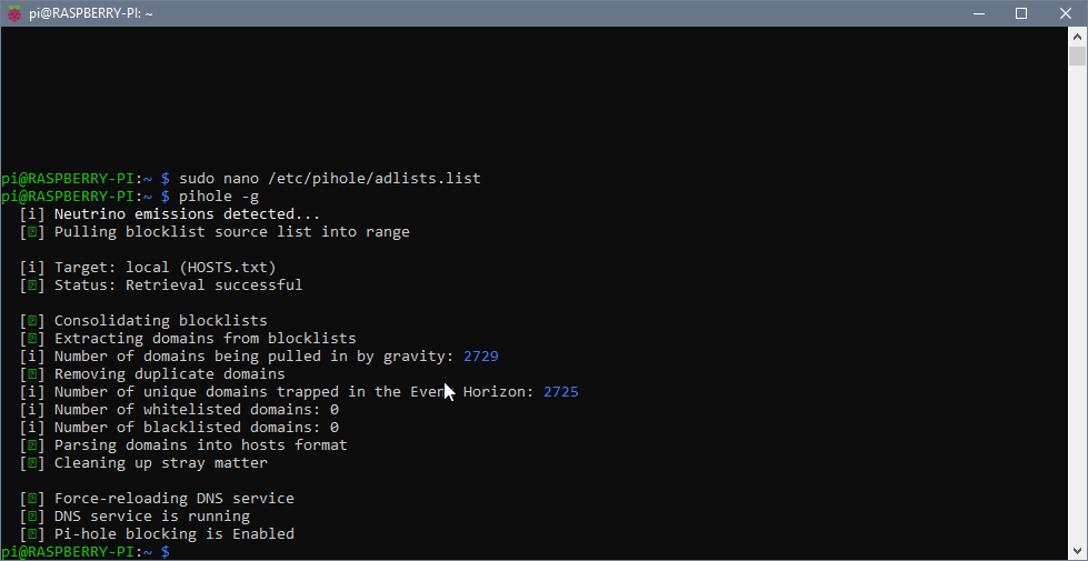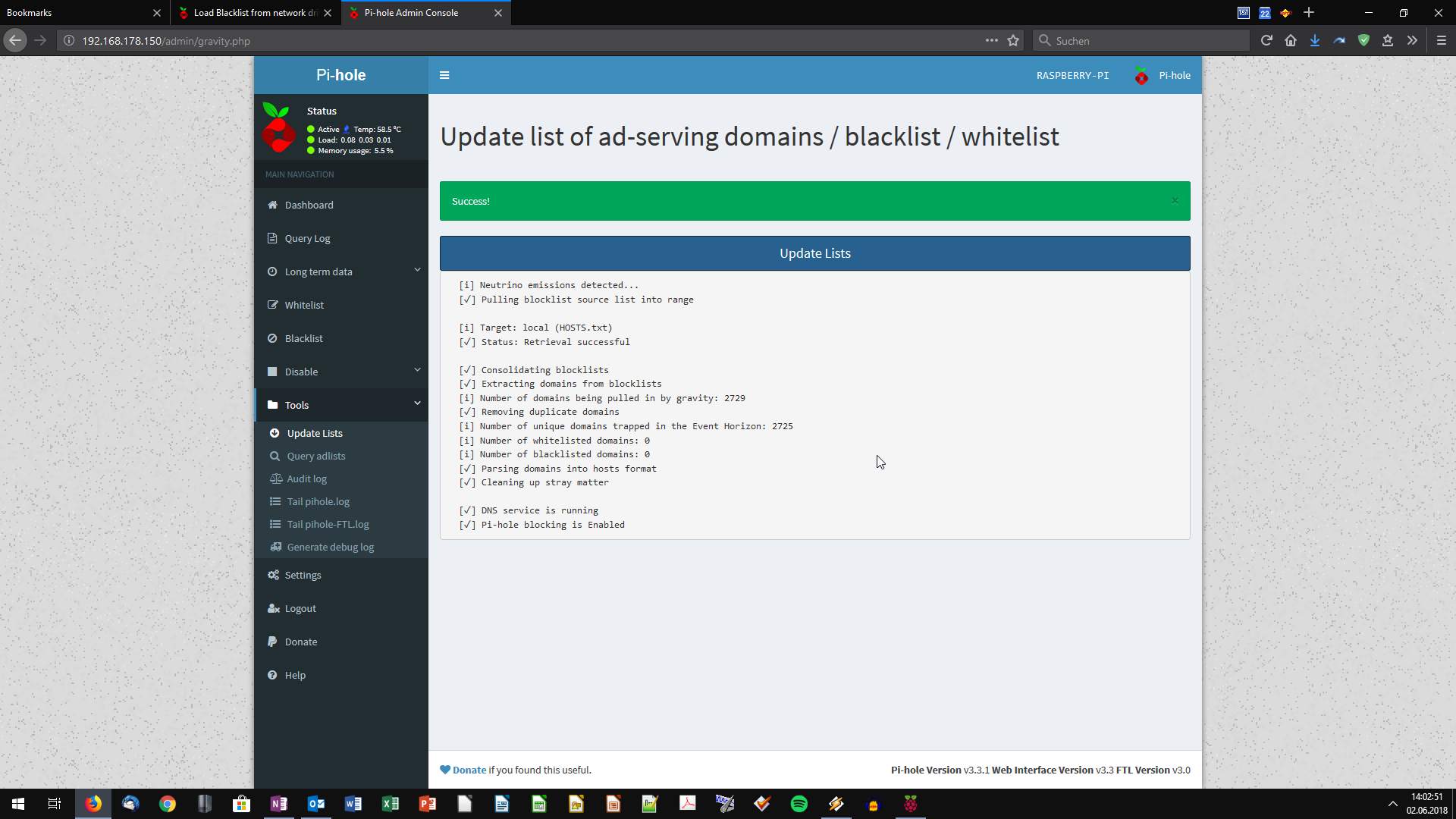 Heard of pi-hole in the german c't magazine about 2 weeks ago and ordered a new Raspberry Pi 3B+ set with power supply, case, HDMI cable and heatsinks for the chips. Everything is up and running, pi-hole works fine. However I have two questtions: