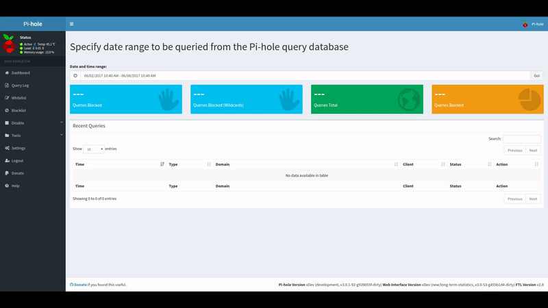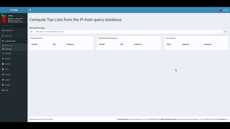 I really like the Pi-Hole project but I“d like something that gives me a better long-term feedback like a hourly, daily, weekly, monthly and even yearly feedback (incl. graph) like I“m used at projects like nagios. So far my querylog grows about 3MB per day which isn“t too big. I think even on a minimal raspberry pi 2/3 system it could hold several weeks to months.