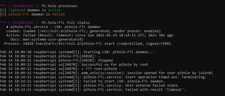 Ich habs durch 8.8.8.8 ersetzt, dann repair. Ist auch soweit durchgelaufen, "restarting pihole-FTL service dauert jetzt immer Ewigkeiten, dann reboot, alles wie vorher.