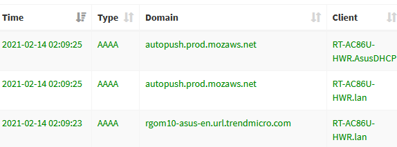 Auch merkwürdig ist, dass im Query log immer noch ein hostname 'AsusDHCP' erscheint, den ich vor ca. einer Stunde mal gesetzt hatte. Dann habe ich den Hostnamen im Router bei DHCP auf 'lan' geändert?!