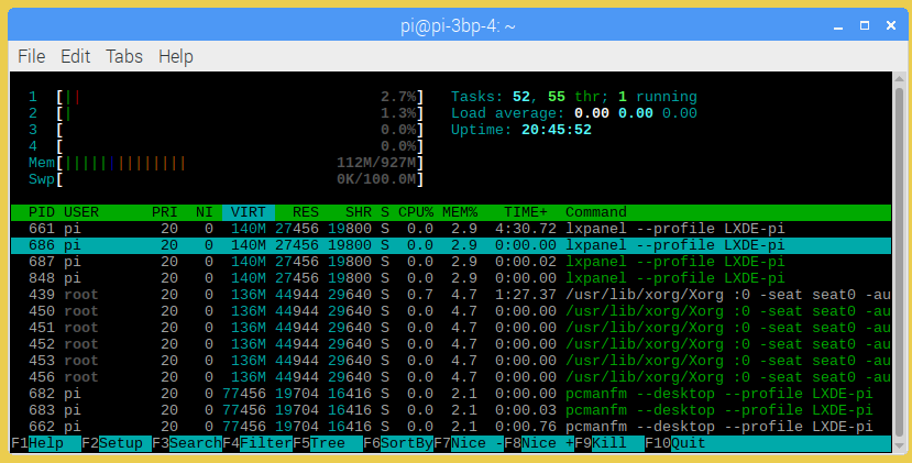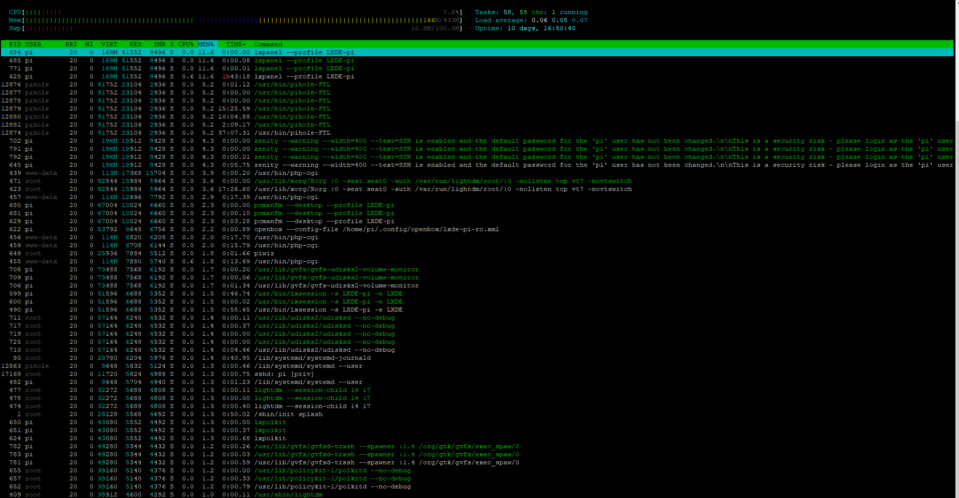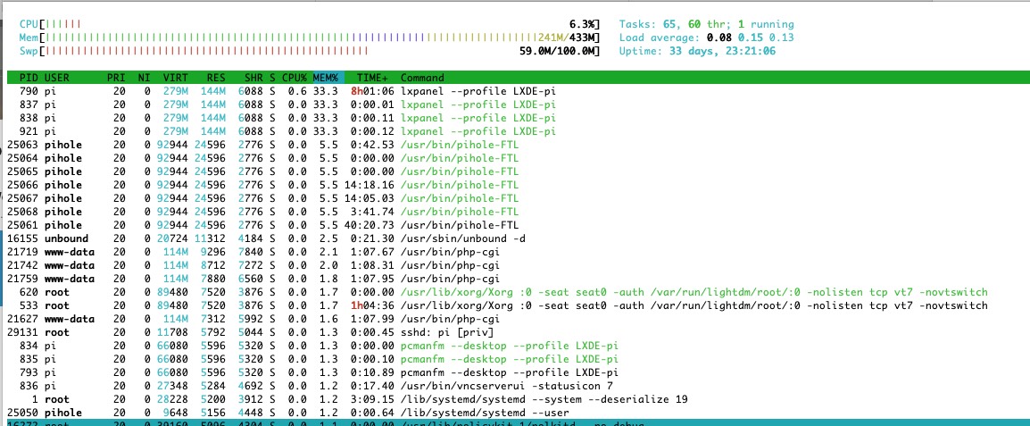 Can you run htop every few hours and see which process has the increasing memory load? Just for comparison, htop for a Zero W running the master branch, the default blocklists, NULL blocking is shown below: