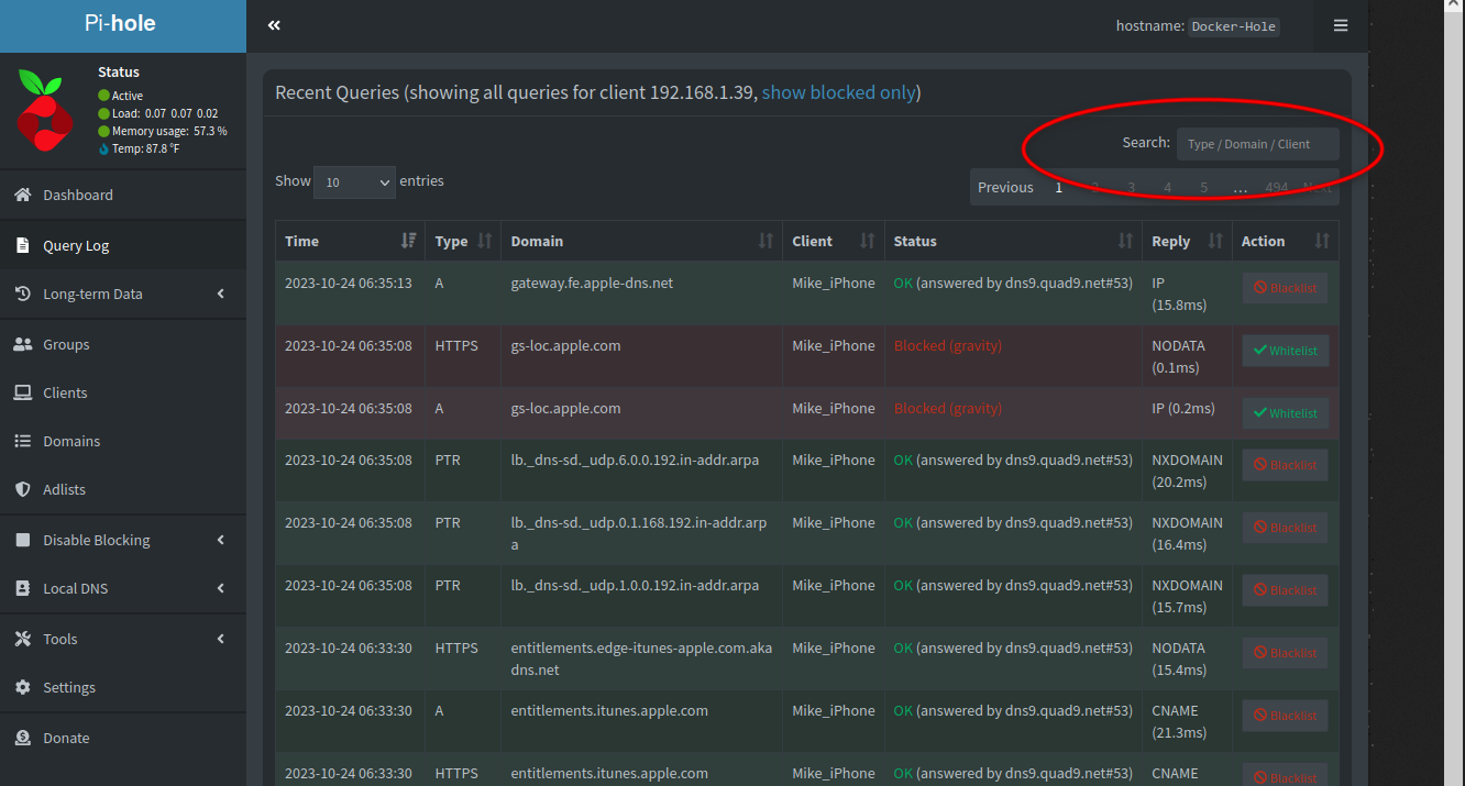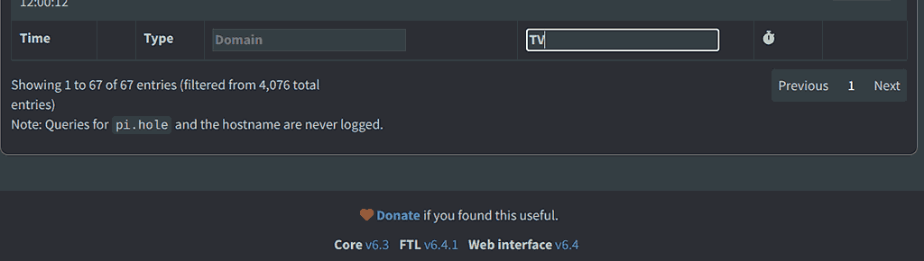Pi-hole 6 has a collapsible detailed search field area at the top, but the request is concerning the two Domain and Client filter fields at the end of the Query Log page: