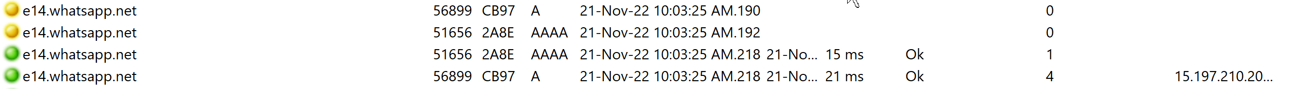 Looking at your first screenshot (I have never used this software myself), it appears that the first A e14.whatsapp.net query has been made at millisecond 190, the next at 218. There have been only 28 milliseconds in between and your unbound may simply not have been quick enough to reply. The reply then arrived at 218+21 = 239 so 49 msec after the initial attempt. Not bad at all I'd say when this wasn't in unbounds cache.