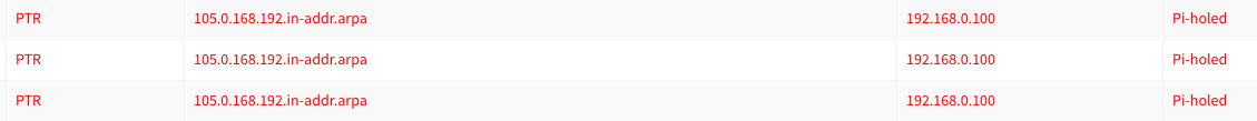 Just FWIW, I experienced the same reverse DNS bug after setting up my Pi-hole yesterday. Please see attached dashboard and query screenshots detailing the culprits (192.168.0.105 being my Pi's LAN address). If I can supply any log information to help fix the bug, please post here.