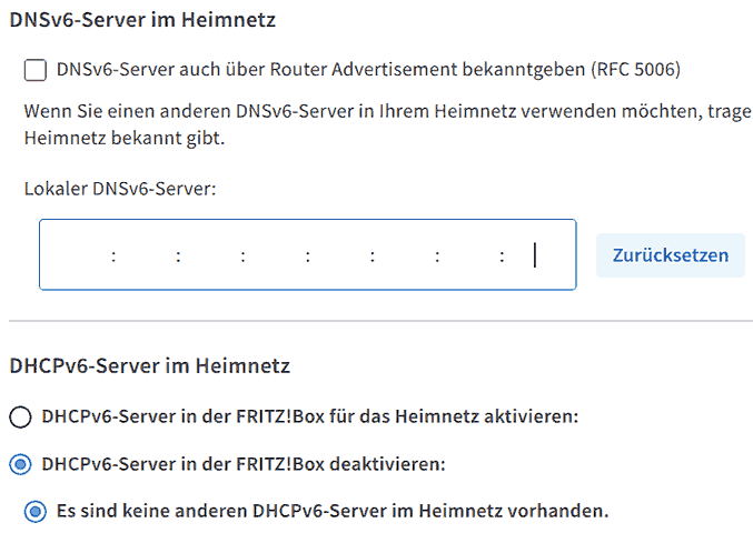 b. DHCPv6-Server in der FRITZ!Box deaktivieren setzen, ebenso