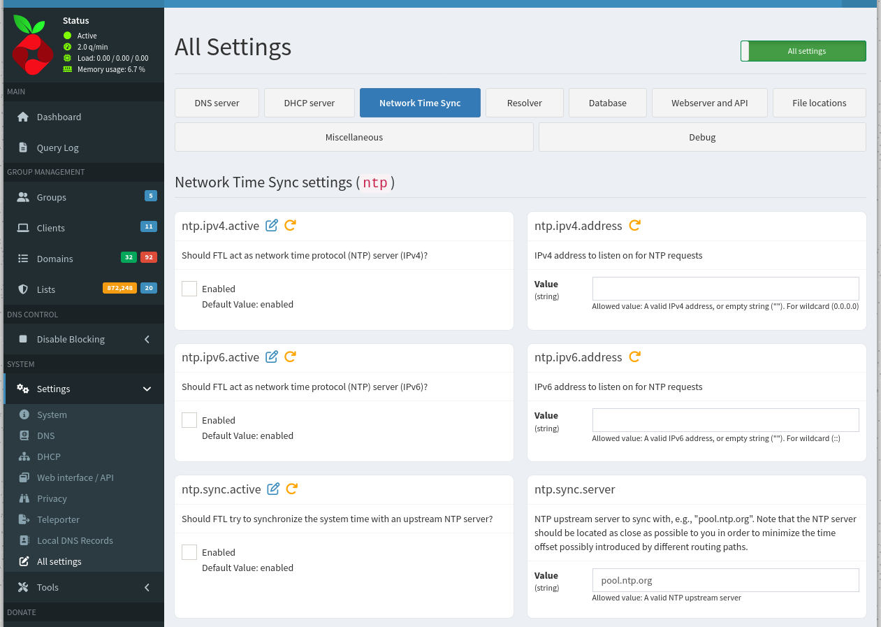 It seems that in times passed, there was an ‘All settings page’ where a local NTP server could be setup for Pihole use. This doesn’t seem to be there now on my current setup: