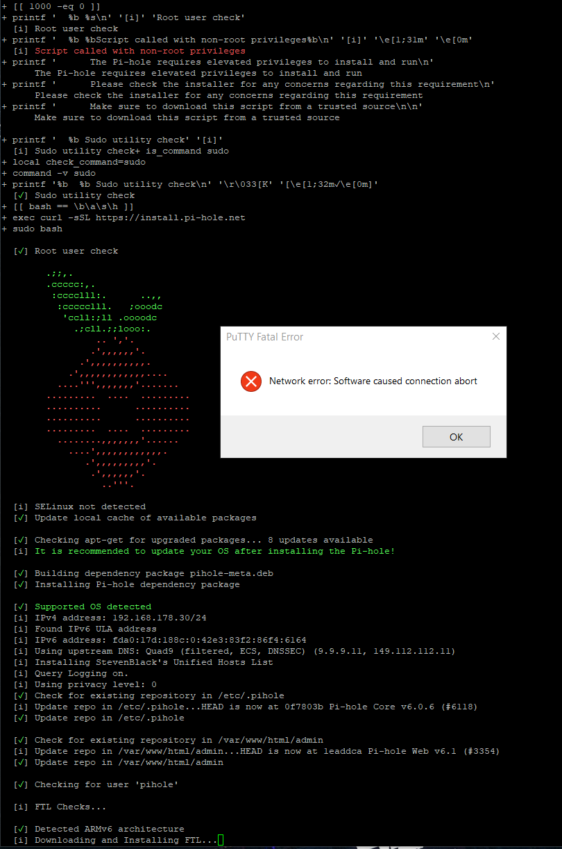 Jedoch bricht die Installation von Pihole immer an dem Punkt ab, wo er FTL herunterladen und installieren will. Nach langer Zeit meldet sich PuTTY mit