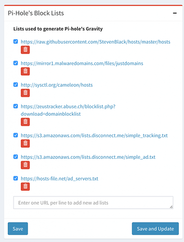 We were finally able to implement a long-awaited feature request, which allows you to edit the source lists used by Pi-hole via the Web interface. You could always do this before, but it should be much easier now.Just remember, they need to be in HOSTS format to be compatible. If you want to find some more lists to use, check out WaLLy3K's compilation.